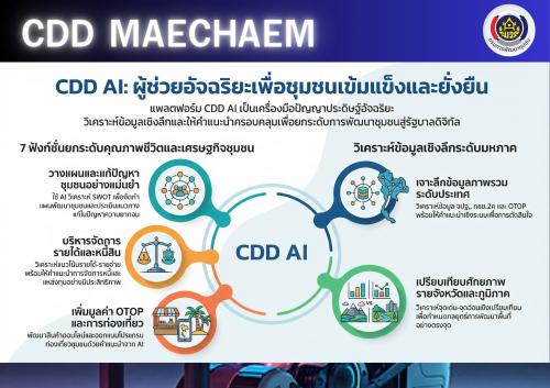 สำนักงานพัฒนาชุมชนอำเภอแม่แจ่ม ประชาสัมพันธ์การใช้งาน CDD AI ผู้ช่วยพัฒนากรอัจฉริยะ เพื่อชุมชนเข้มแข็งอย่างยั่งยืน แพลตฟอร์ม AI และข้อมูลเชิงลึก สำหรับพัฒนากร หน่วยงาน และชุมชน ครบในที่เดียว ตอบทุกเรื่องงานพัฒนาชุมชน CDD AI ออกแบบเพื่อยกระดับการให้บริการของกรมการพัฒนาชุมชนสู่ Digital Government อย่างแท้จริง ด้วยเทคโนโลยีปัญญาประดิษฐ์ (AI) พัฒนาโดย กรมการพัฒนาชุมชน Chatbot ผู้เชี่ยวชาญงานพัฒนาชุมชน ให้คำตอบและคำแนะนำในหลากหลายด้าน ใช้ภาษาไทยที่เข้าใจง่าย วิเคราะห์ตามบริบทพื้นที่อย่างลึกซึ้ง เป็น “ผู้ช่วยดิจิทัล” ที่เรียนรู้และพัฒนาอย่างต่อเนื่องยกระดับการทำงานพัฒนาชุมชนในทุกมิติ